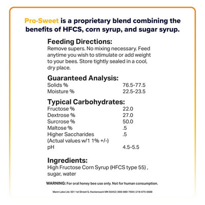 Pro-Sweet™ contains a balanced blend of disaccharide and monosaccharide sugars designed to support colony feeding during nectar shortages or seasonal transitions.